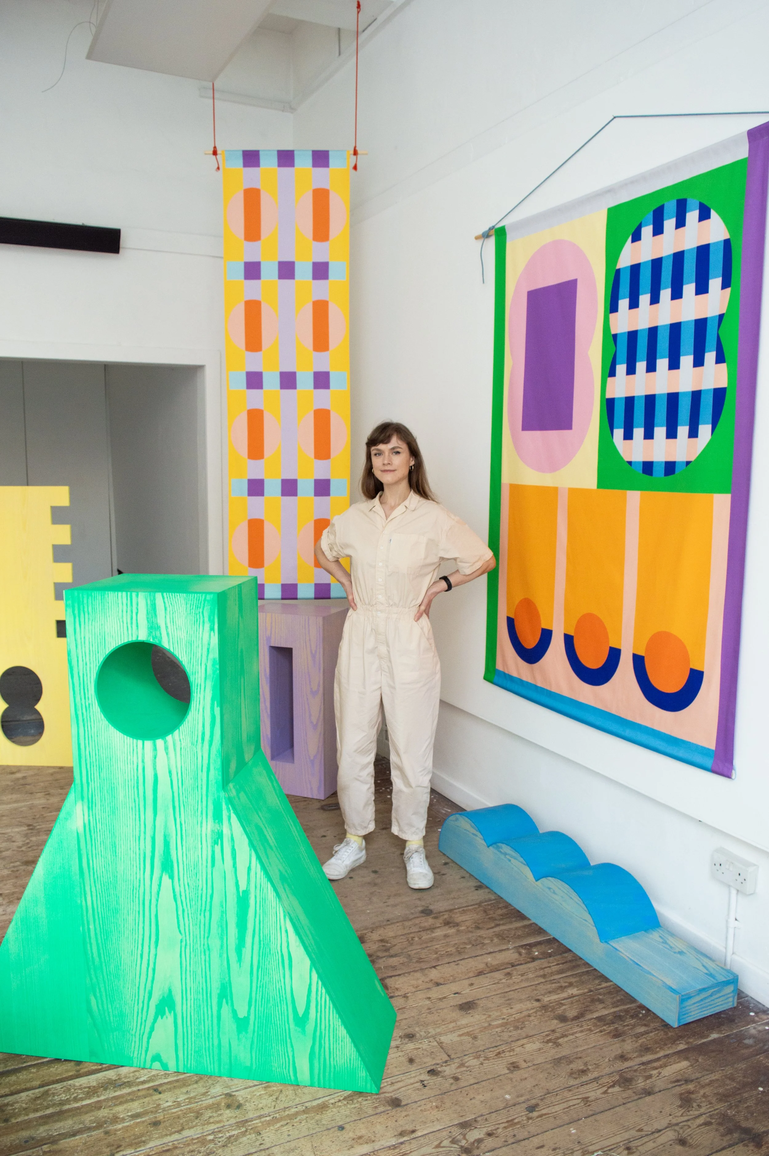 Emer creates playful interventions in space using bold colour and abstract forms, that invite viewers to explore, occupy and interact with an environment.